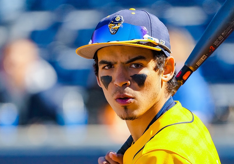 May 1, 2021, GRAND RAPIDS, Mich. -- Fernando Rivera-Calderon powered Grand Rapids Community College’s baseball team to a doubleheader win over Kalamazoo Community College on Saturday.