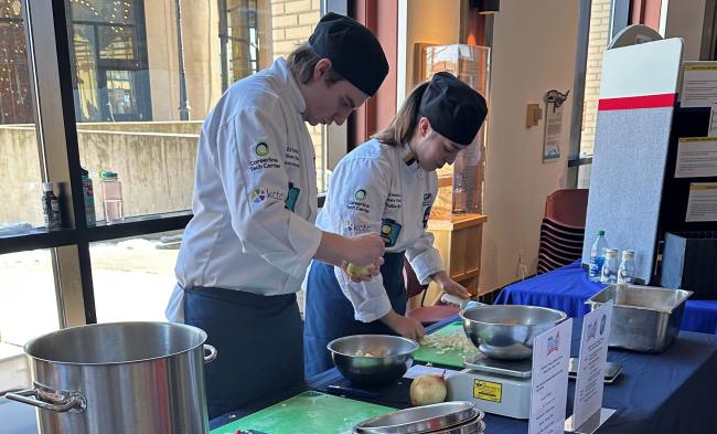 The Secchia Institute is partnering with the Ottawa Area Intermediate School District’s Careerline Tech Center, with students Katie Bird and Devon Vanderwall preparing a recipe of Austrian style steak soup.