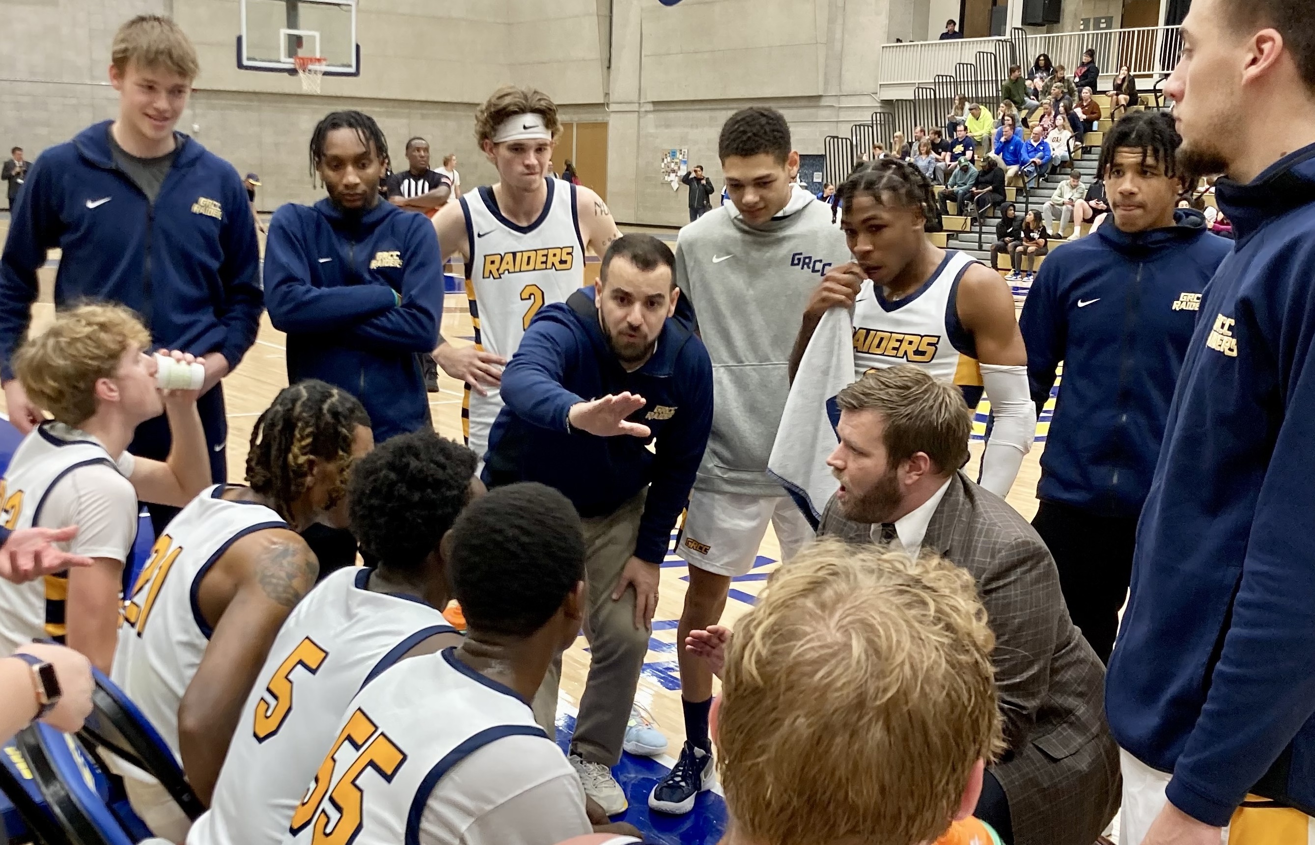 A first-year assistant coach for the Grand Rapids Community College’s men’s basketball team, Hoxha said he gets nervous before every game. But on this mid-November day, he and the Raiders are 2 ½ hours away from tipoff against their archrivals, the Lansing Community College Stars.
