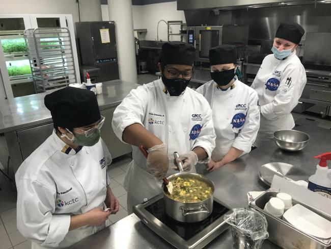 NASA required teams to submit two healthy “comfort food” recipes. After evaluating both submissions from the KCTC-GRCC team, NASA experts picked a recipe for chili verde with rice and beans for the students to develop further.