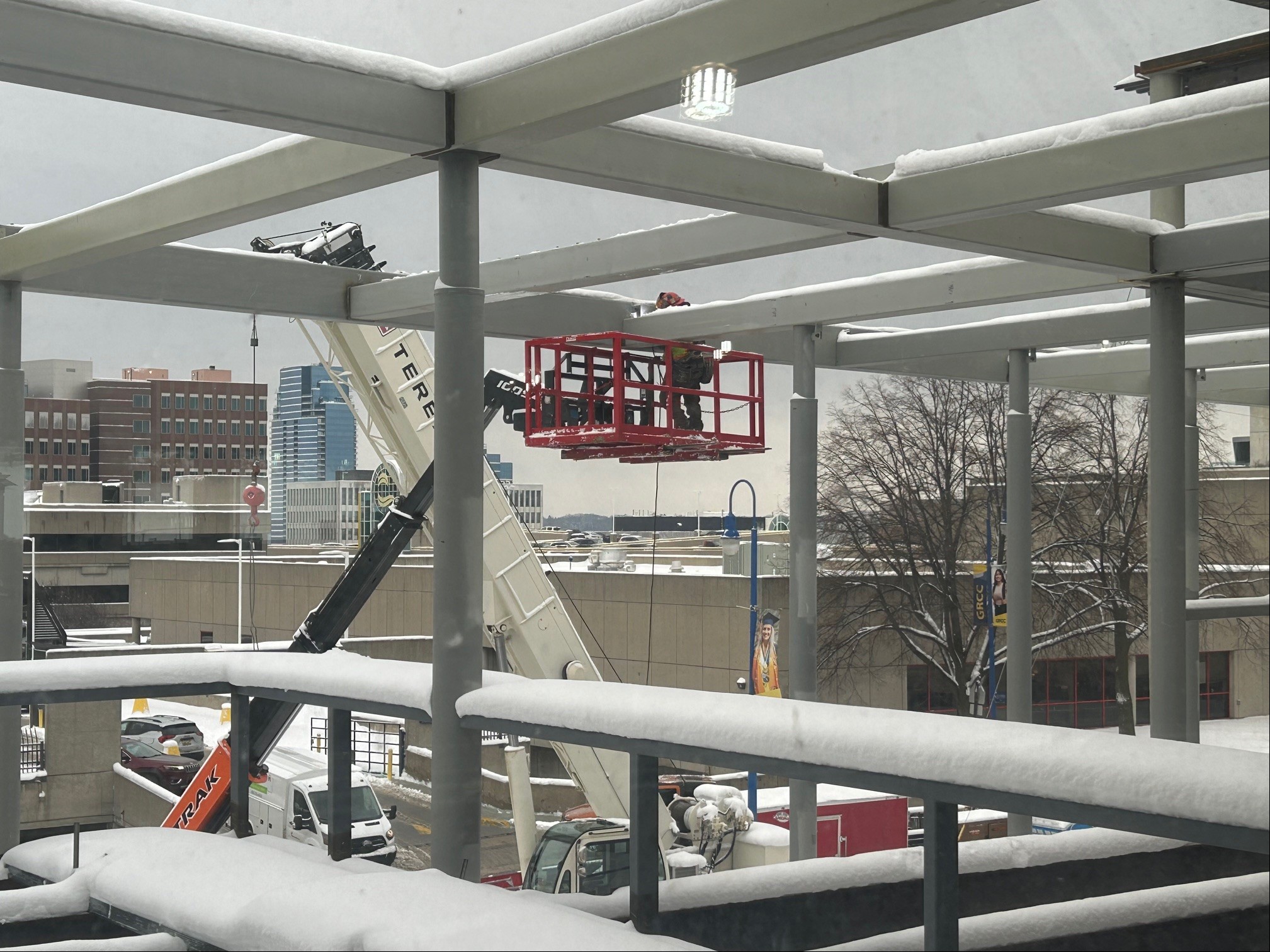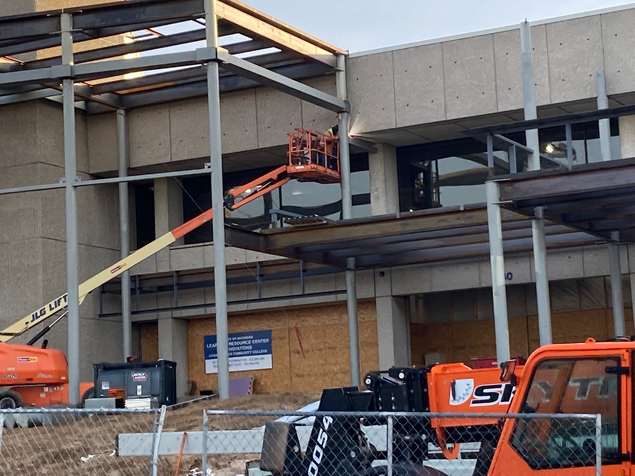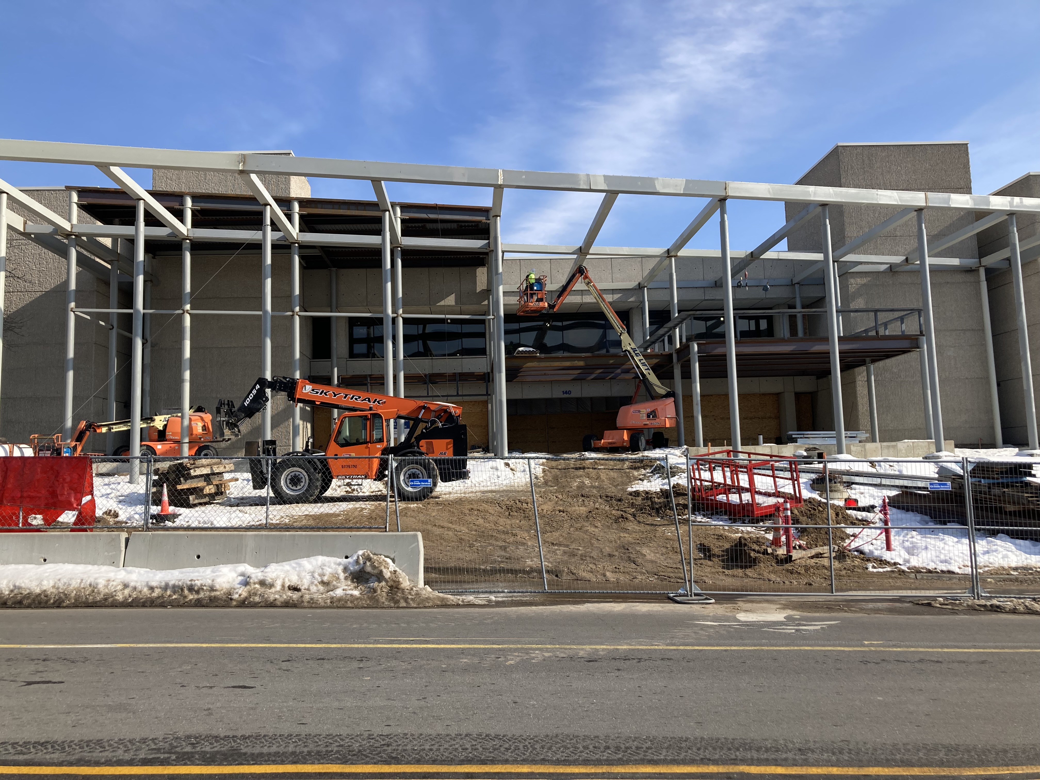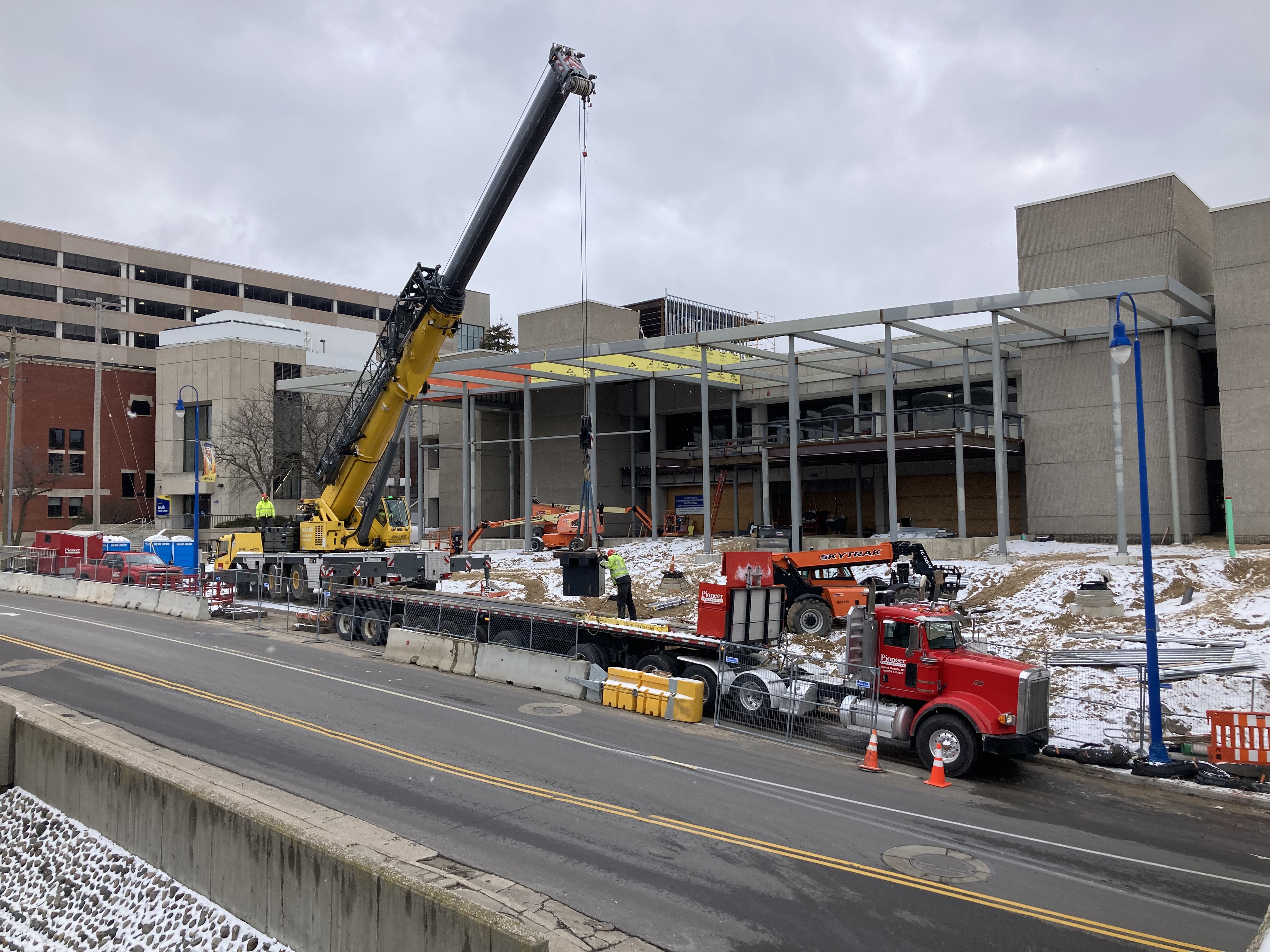 Cranes, lifts and workers with welders were busy installing the columns and welding the beams for the LRC canopy addition. Steel arrived late December and by the end of January the beginning of the addition was prominent. The snow, wind and cold did not stop progress!