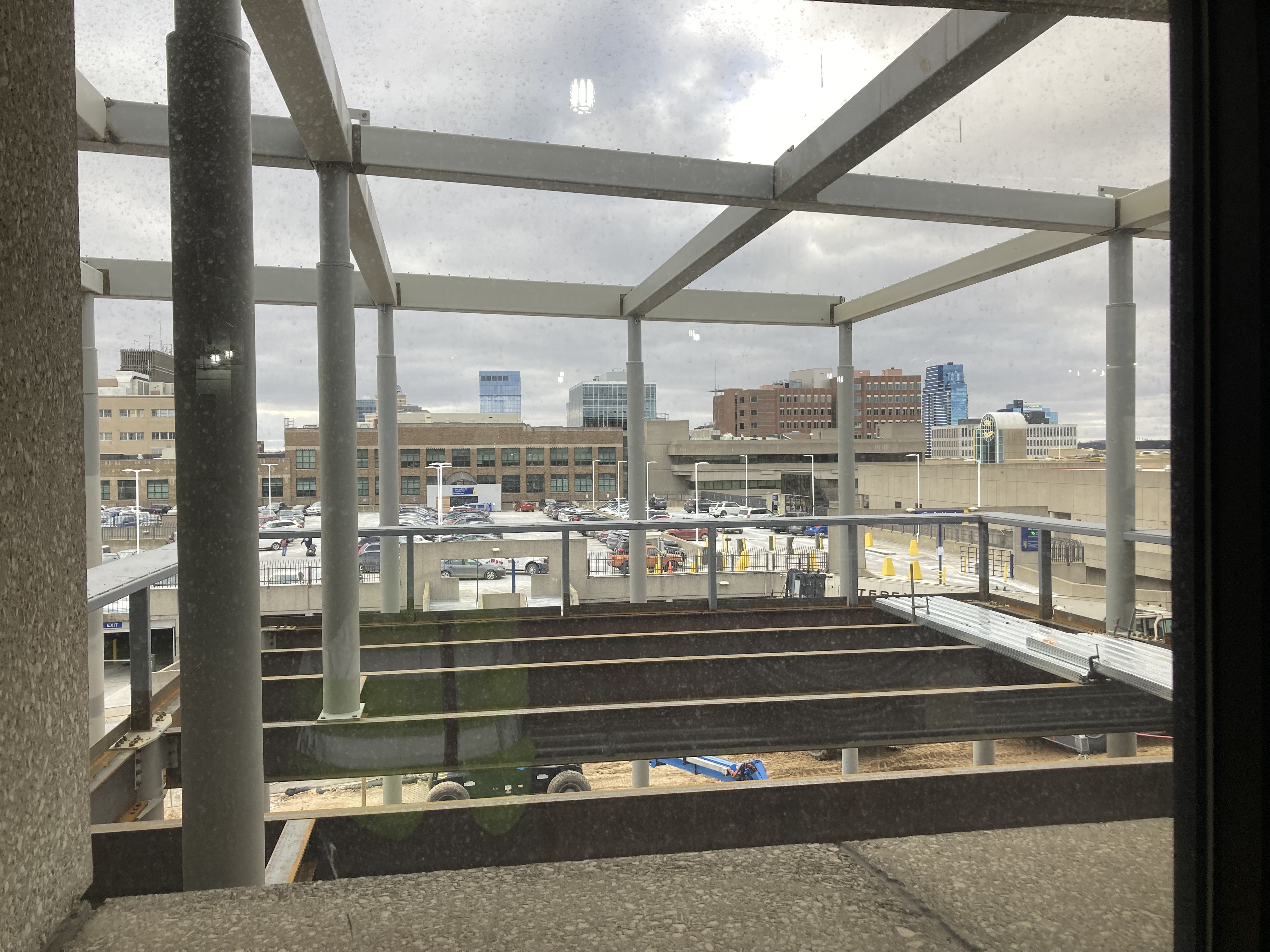 Partial demolition of the northwest penthouse is taking place. 7 feet of concrete is being removed and will be replaced with a new steel portion. The LRC’s penthouse is not a luxury apartment, for people anyway, it is a place where electrical equipment, chillers, boilers and air handlers live. It helps protect them from the weather and saves space inside the building.