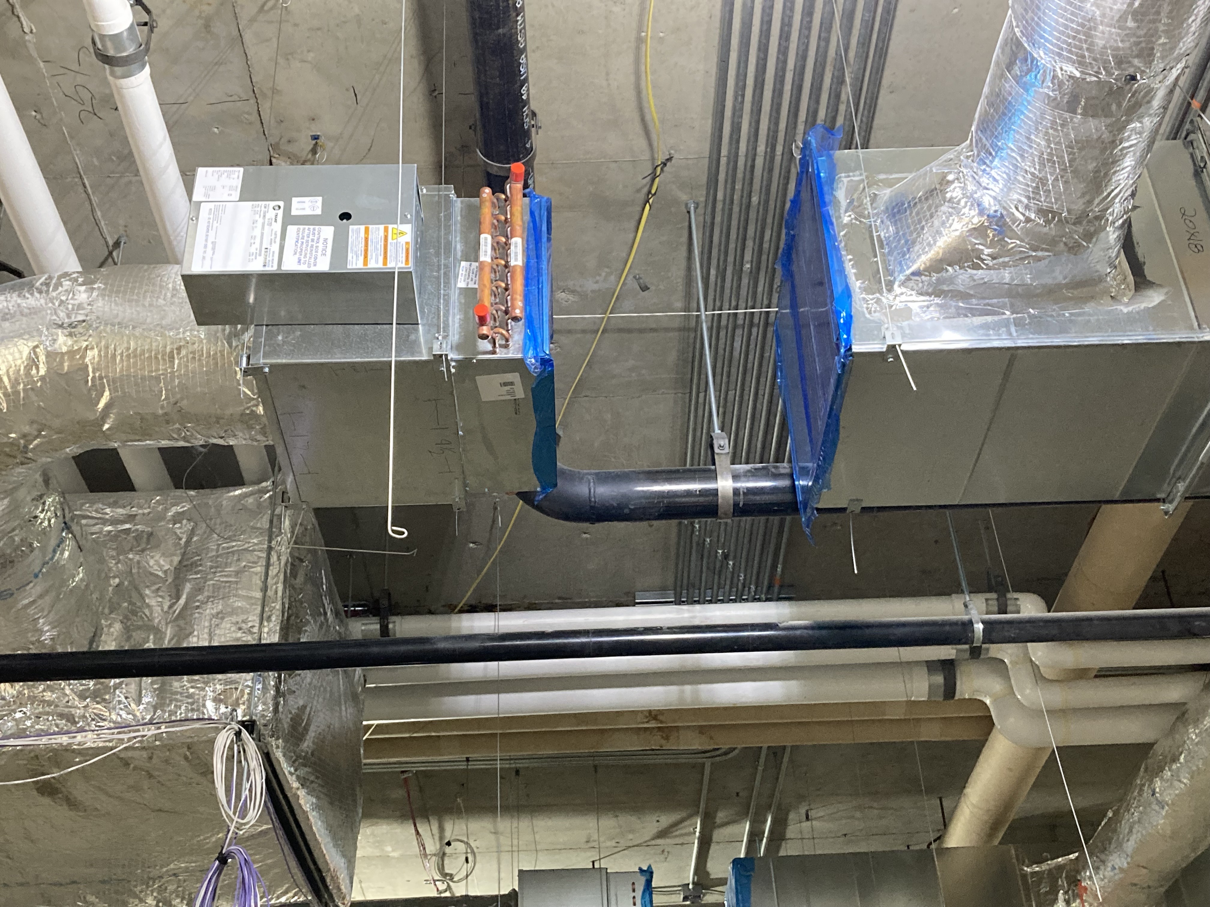 HVAC work continues with continued installation and insulation of ductwork. The HVAC crew has installed the reheat coils. These HVAC components help to keep temperatures and humidity in buildings at a comfortable level.