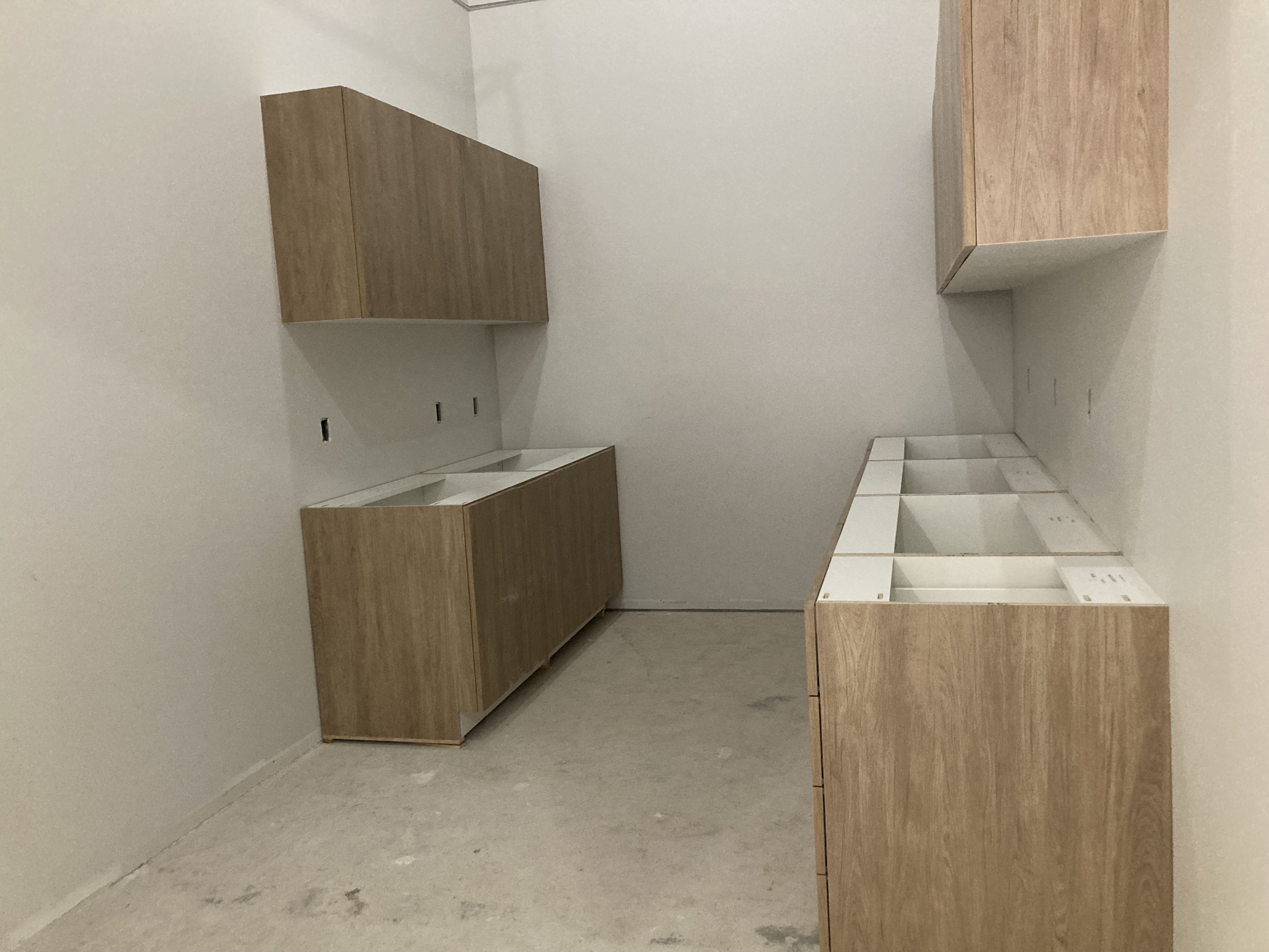 Carpenters installed cupboards in the employee kitchenette. There are several electrical outlets on both sides and lots of storage space!