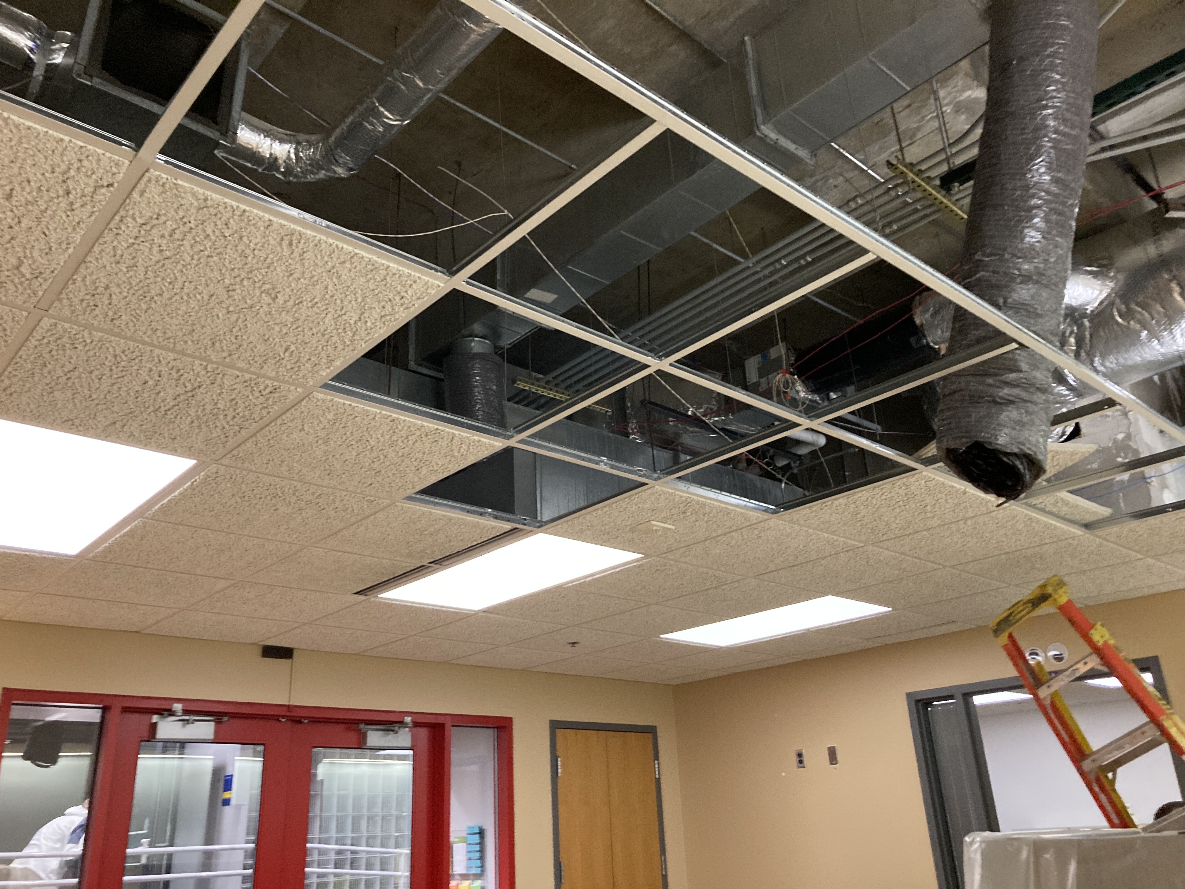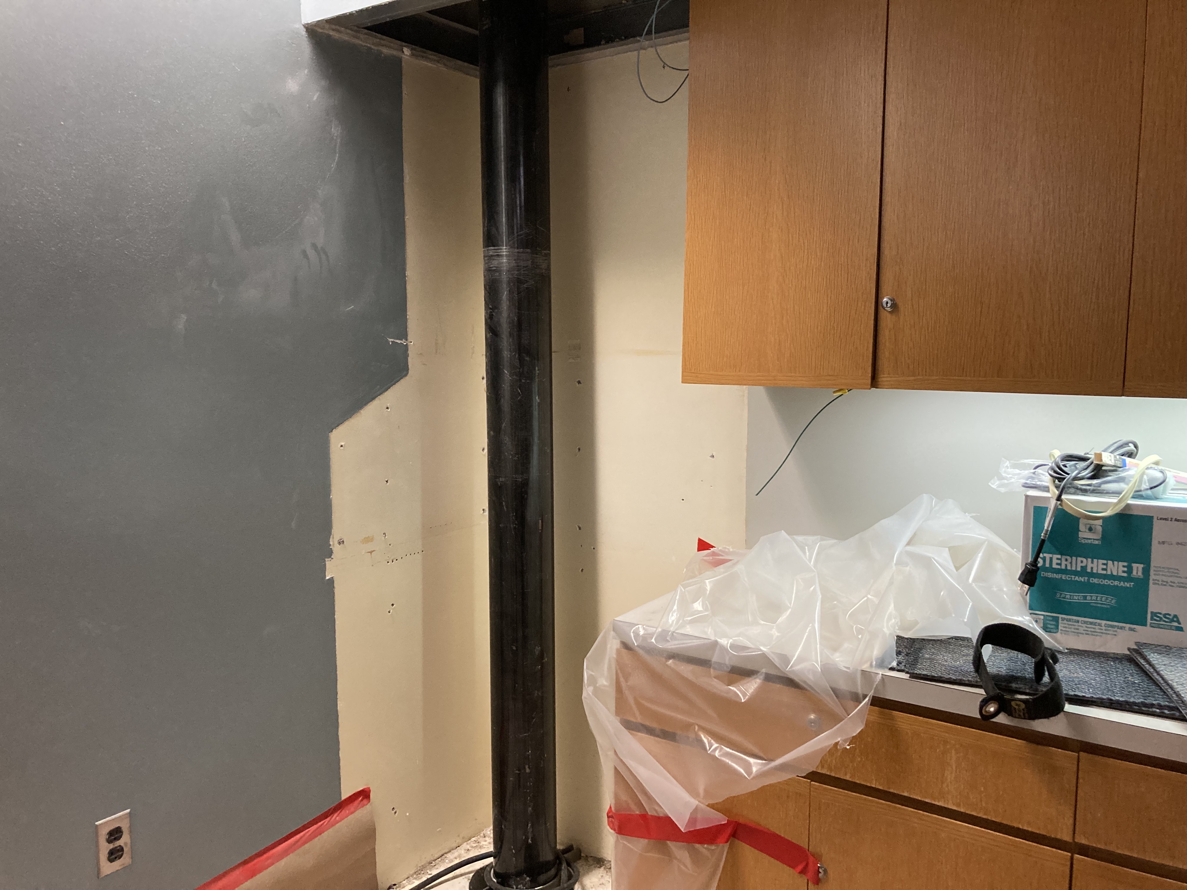 Contractor DHE needed to work in the office space so they could route two new pipes that connect the rooftop unit to the main system piping in the lower-level mechanical room. They had to run the pipes in a different location than the original chase (an enclosed space in a wall used to run pipes, duct work and/or electrical wires) due to the chase size and logistics. They had to modify the kitchenette countertop and move ductwork, electrical and existing piping out of the way to install the new pipes.