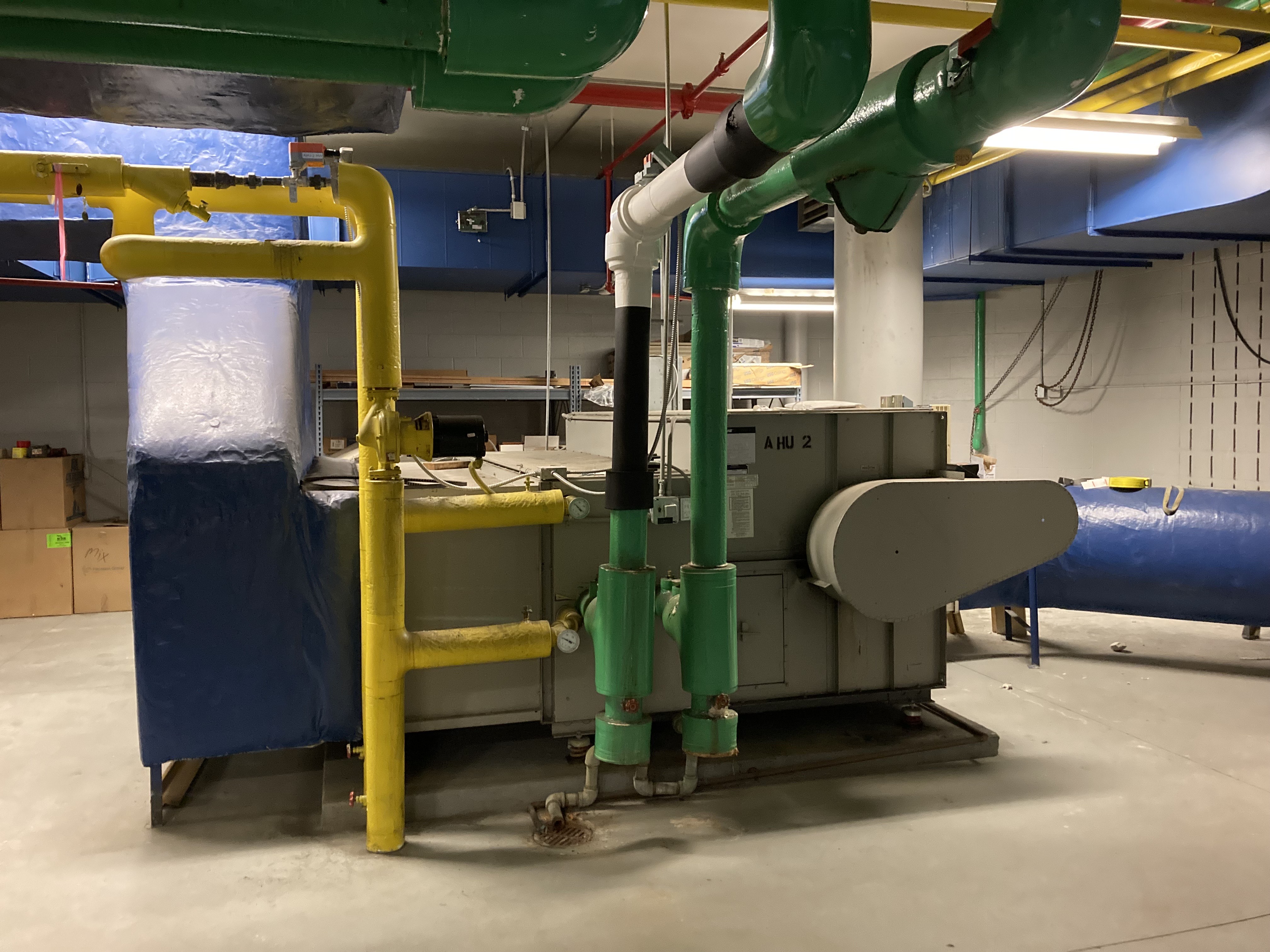 Heating, Ventilation and Air Conditioning (HVAC) equipment is located in two different rooms at the ATC. One room houses the swing chiller (soon to be new swing chiller) and the main chiller. The other room houses the air handler (what you would call a furnace at your house). All the equipment in these rooms are connected to each other and to the rooftop unit. The HVAC components are labeled and the ones in the air handler room are color coded. Blue is for duct work, yellow is for heat, and green is for the chiller, in case you happen to wander by the room and wonder why it is so colorful.