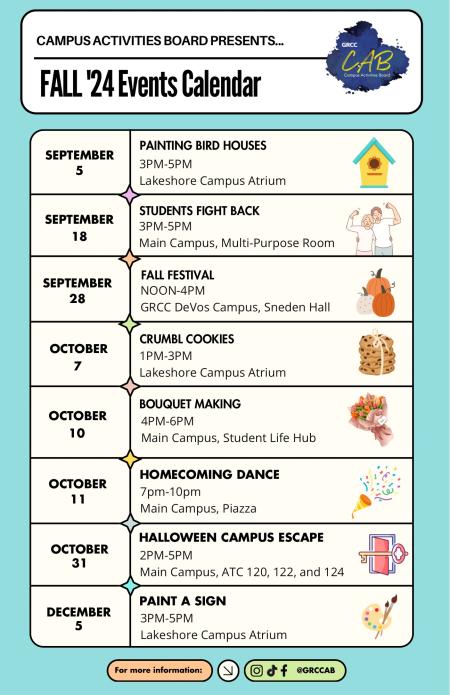 Campus Activities Board is one of the three appointed student organizations tasked with creating quality events and experiences that inspire all students to become involved in the campus community, to feel a sense of belonging, and to grow and develop as individuals at Grand Rapids Community College. CAB consists of four leadership positions including the President, Vice President, Communications Director, and Secretary. This student organization is housed within the Center for Student Life & Leadership and reports to the Assistant Director of Campus Activities and Conduct/CAB Advisor.