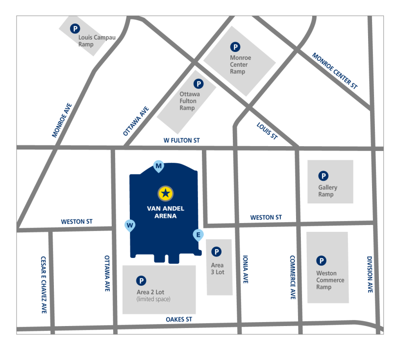 - Accessibility: ADA Entrance to Van Andel Arena is in the SW Entrance, and can be accessed via Ottawa St. ADA seating is available in section 109 at the arena. Arena ushers will be available to guide guests there.